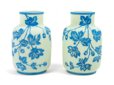 a pair of cameo glass vases, each of barrel form with foliate decoration