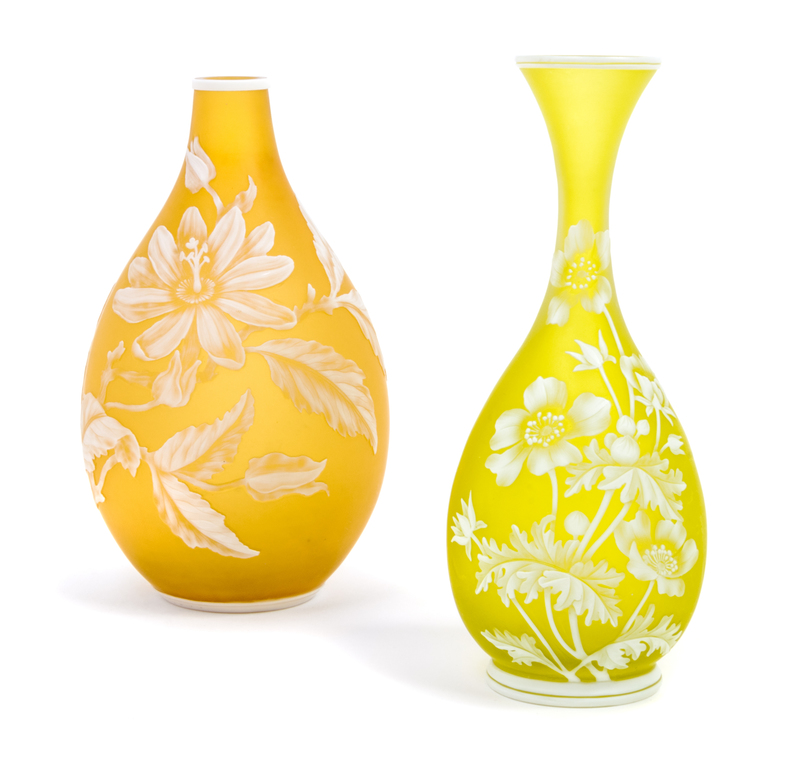 a cameo glass vase, of bottle form with flared mouth, having floral and butterfly decoration, with circular mark to base, together with an unmarked example with floral and dragonfly decoration