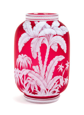 a cameo glass vase, of barrel form with palm tree decoration, unsigned