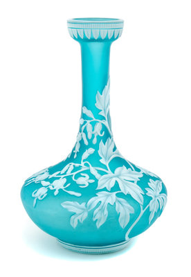 a cameo glass vase, of bottle form with flared, decorated mouth, the body with bleeding heart floral decoration
