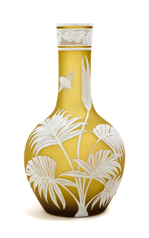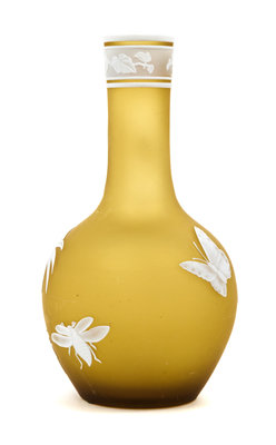 a cameo glass vase, of bottle form with fern and insect decoration