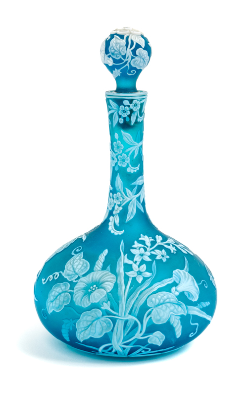 a cameo glass bottle, with allover floral decoration, with cameo decorated stopper