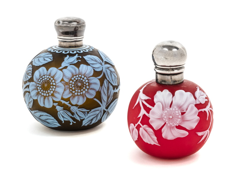 two silver mounted cameo glass perfume bottles, each of spherical form with floral decoration