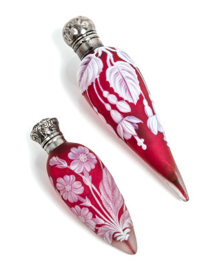 two silver mounted cameo glass perfume bottles, each of tapering form with floral decoration