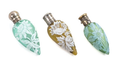 three silver mounted cameo glass perfume bottles, each of tapering form with floral decoration