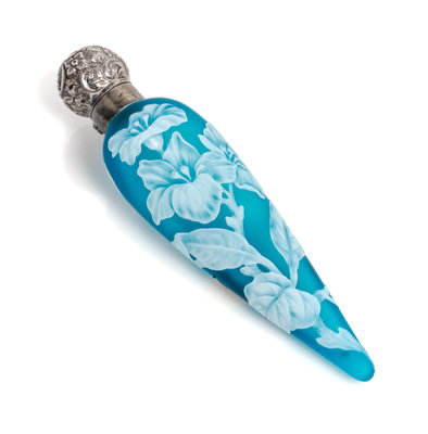 a silver mounted cameo glass perfume bottle, of tapering form with floral decoration