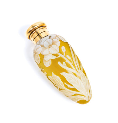 a 15K yellow gold mounted cameo glass perfume bottle, of tapering form with floral decoration