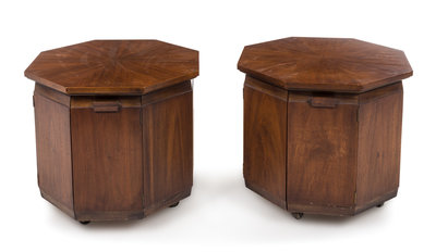 a pair of Arts and Crafts style octagonal occasional tables/cabinets, on casters