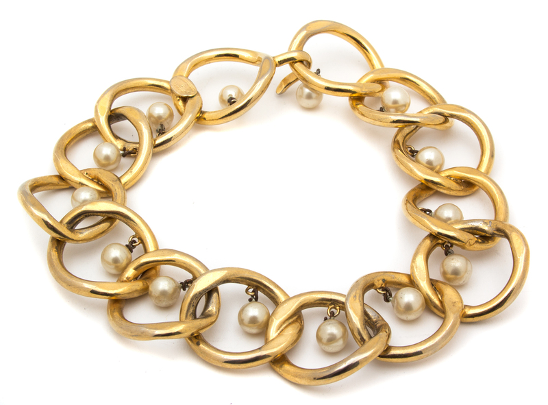 with interlocking goldtone links, faux pearl drops and a hook closure.Stamped: Chanel.
