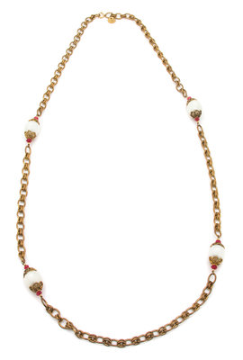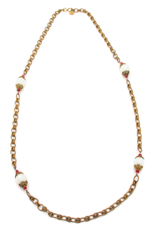 1983,with interlocking links, oversized faux pearls, pink glass beads and a spring ring closure. Together with a box.Stamped: Chanel.