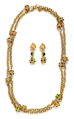 1971-1980,consisting of a goldtone link necklace with goldtone spheres embellished with multicolor glass beads and a spring ring closure; together with a matching pair of drop earclips with green stone and embellished goldtone sphere detail.Stamped: Chanel.