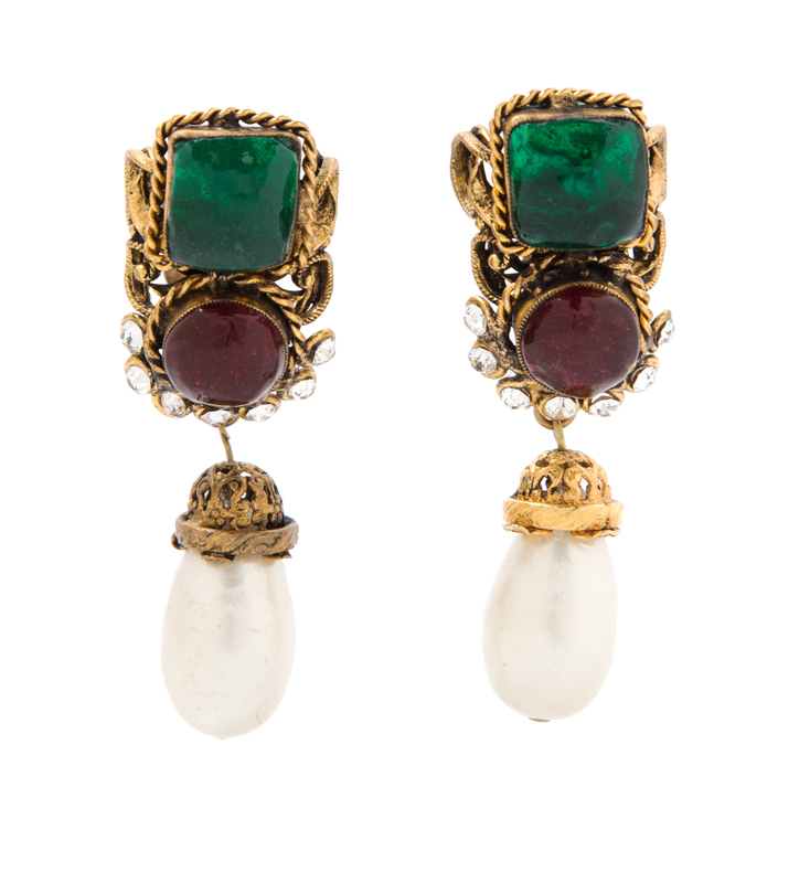 1984,goldtone with red and green glass stones, rhinestone embellishment and pearl drops.Stamped: Chanel.