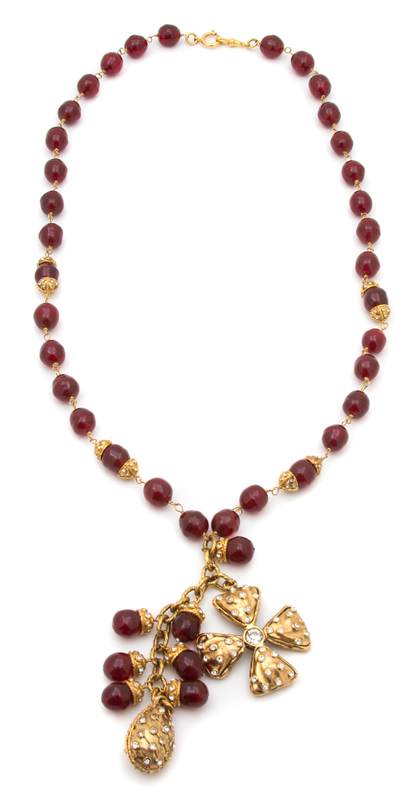 1985,comprised of a necklace with red glass beads, a goldtone chain pendant with rhinestone embellished charms; together with a matching pair of earclips. Together with a box.Stamped: Chanel.