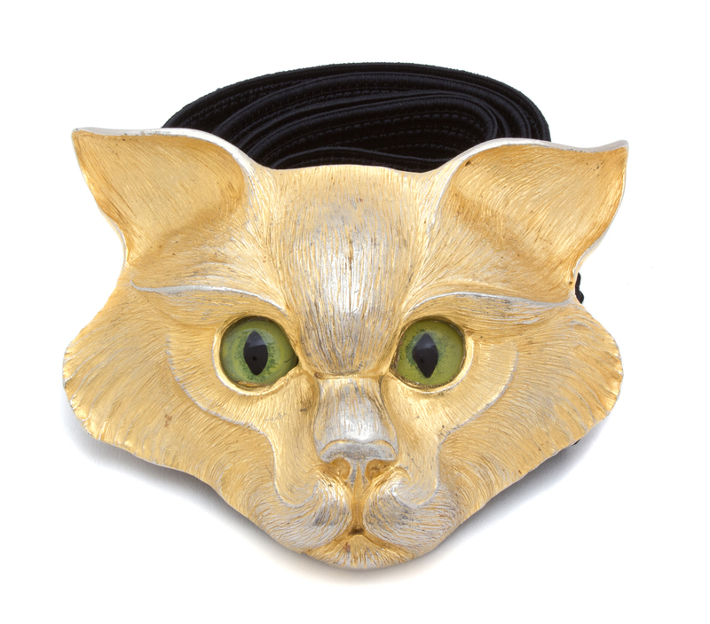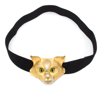 1988,with an oversized cat head buckle with green glass eyes and an adjustable black textured canvas belt. Stamped: Christopher Ross.