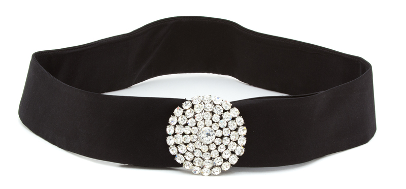 with a black satin adjustable belt and a slide clasp closure.Unstamped.