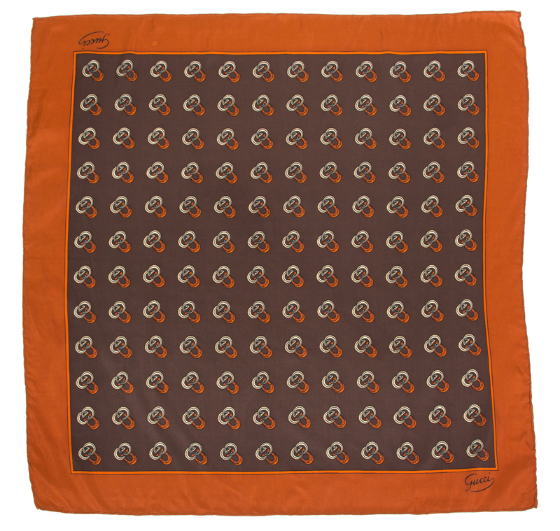the first: navy with a logo motifthe second: rust and brown with a horseshoe motif Each labeled within the print: Gucci.