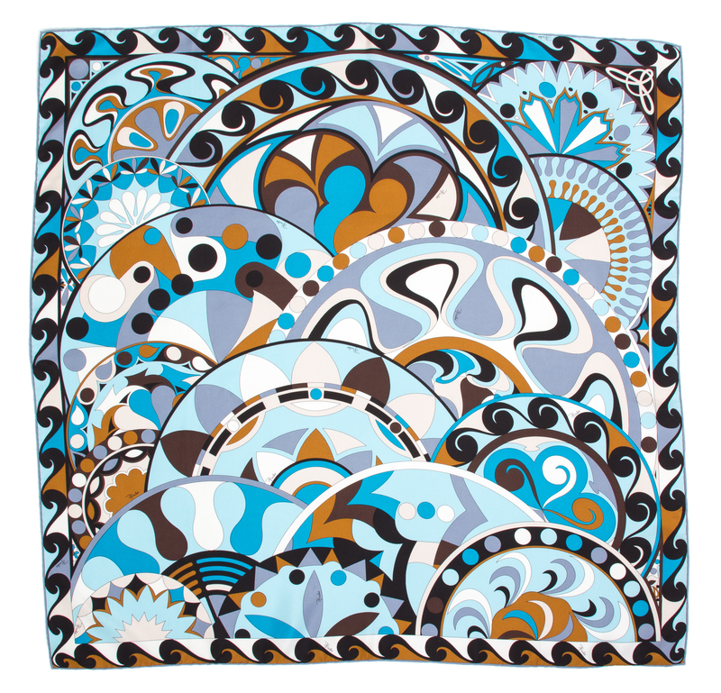 with a cream, black, blue, brown and gray pattern. Labeled: Emilio Pucci.