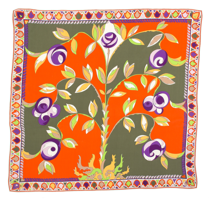 with a green, orange, yellow and purple pattern.Labeled within the print: Emilio Pucci.