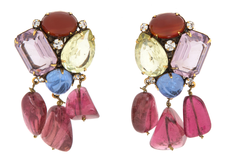 with multicolor stones, rhinestone detail and goldtone hardware.Stamped: Iradj Moini.