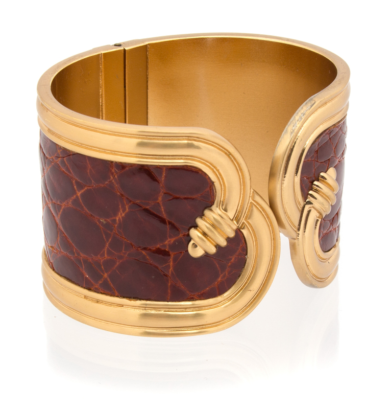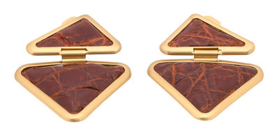 consisting of a hinge cuff bracelet; together with a matching pair of triangular drop earclips. Together with a box.Stamped: Loewe.