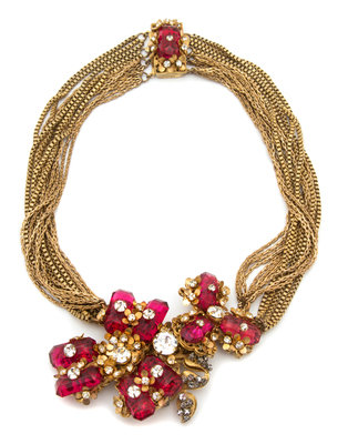 circa 1950, with mixed goldtone chain detail, large red rectangular rhinestones, clear rhinestone detail, goldtone floral embellishment and a decorative slide clasp closure.Stamped: Miriam Haskell.
