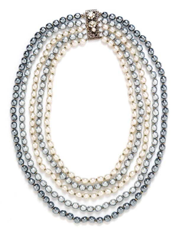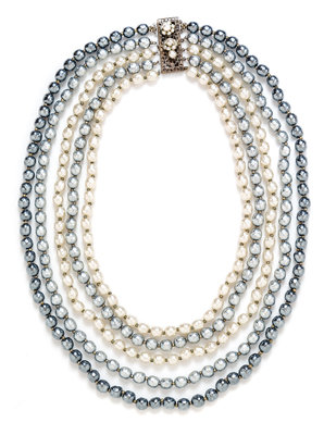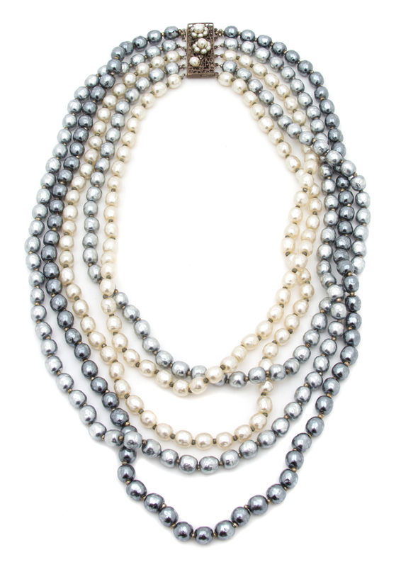 with five strands of white and gray pearls and a decorative slide clasp closure.Stamped: Miriam Haskell.