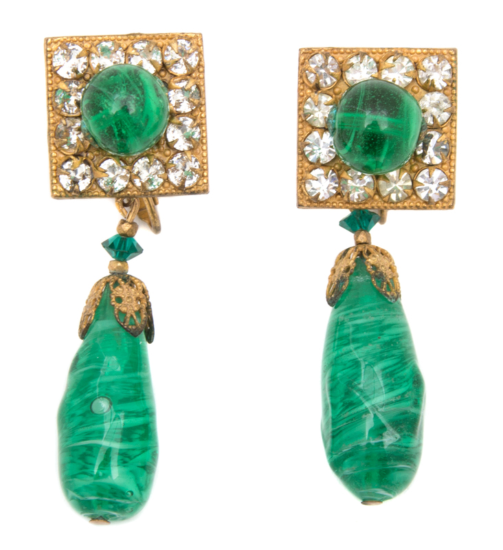 A Pair of Miriam Haskell Green Glass Drop Earclips,