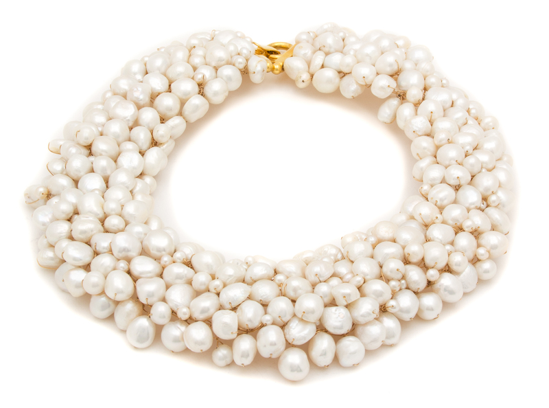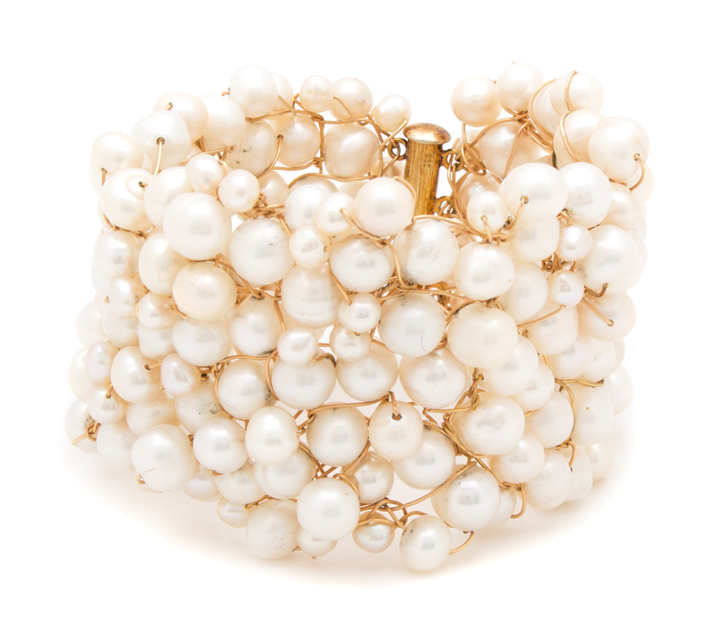 consisting of a collar necklace with various size pearls, decorative goldtone wiring and a gold plated sterling silver clasp closure; together with a matching cuff bracelet with a cylinder slide closure.Unstamped.