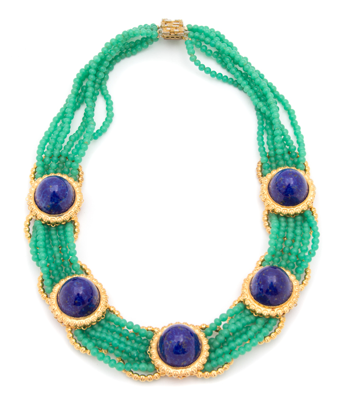 1975,multistrand with five large lapis stones in a goldtone cabachon setting and a decorative gold plated back clasp closure.Attributed to: William de Lillo.