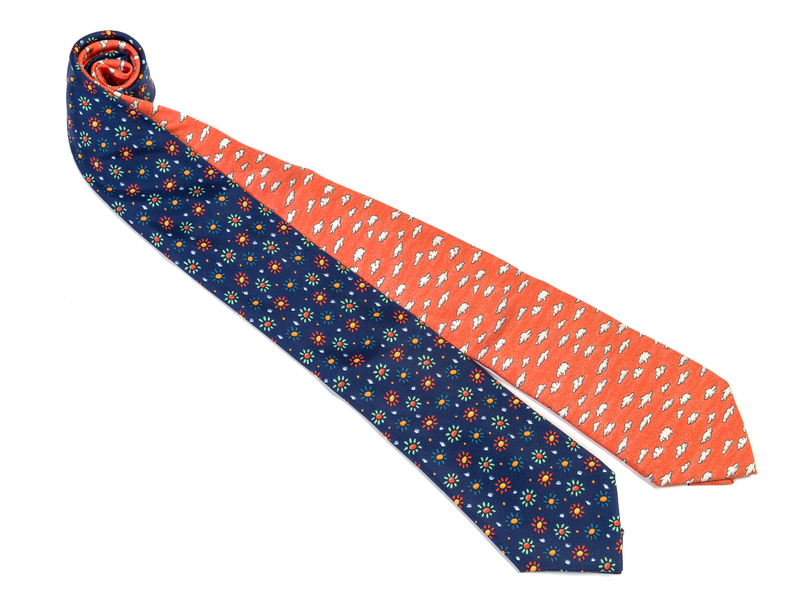 the first: orange with a whimsical animal cloud motifthe second: navy with an abstract floral motifEach labeled: Hermes.