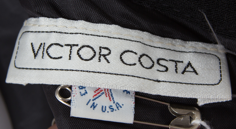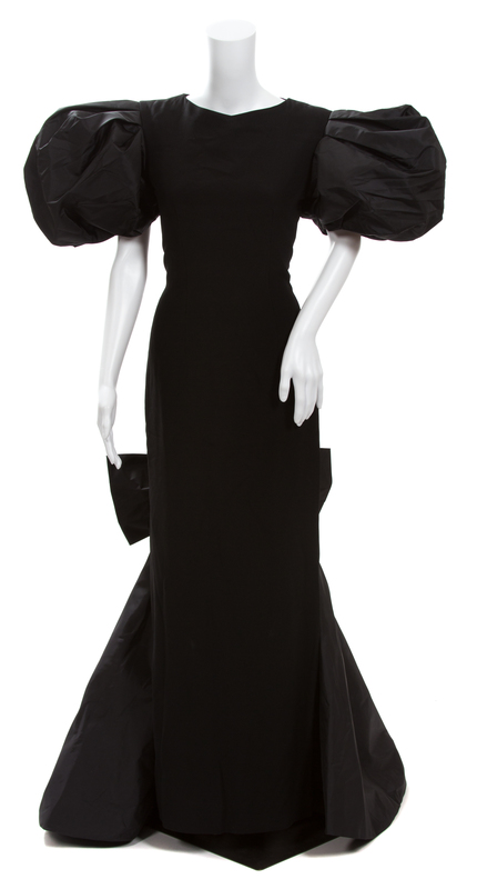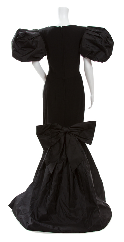 with a fitted silhouette, a jewel neckline, dramatic pleated and puffed short sleeves, a petticoat skirt at the back train with a large bow detail and a back zip closure.Labeled: Victor Costa.