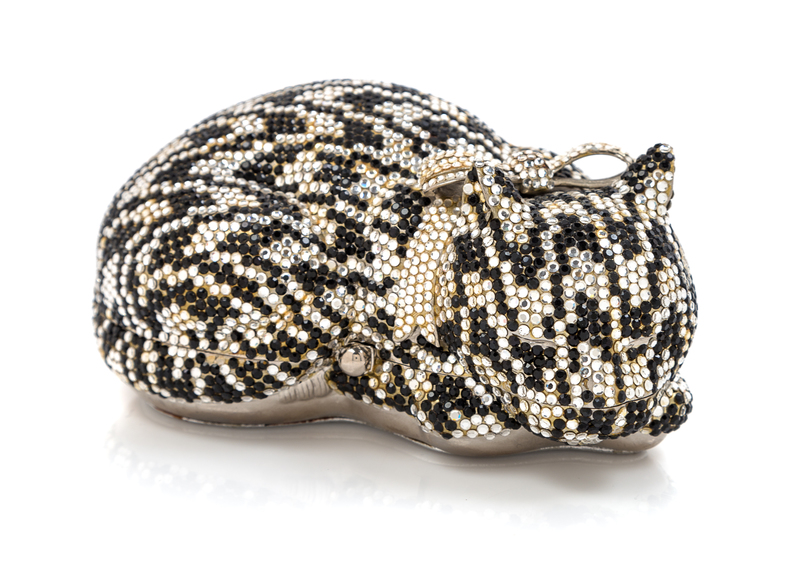 with a decorative silvertone push button front center closure, silvertone hardware and two silver leather interior compartments.Stamped: Judith Leiber.