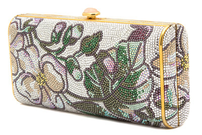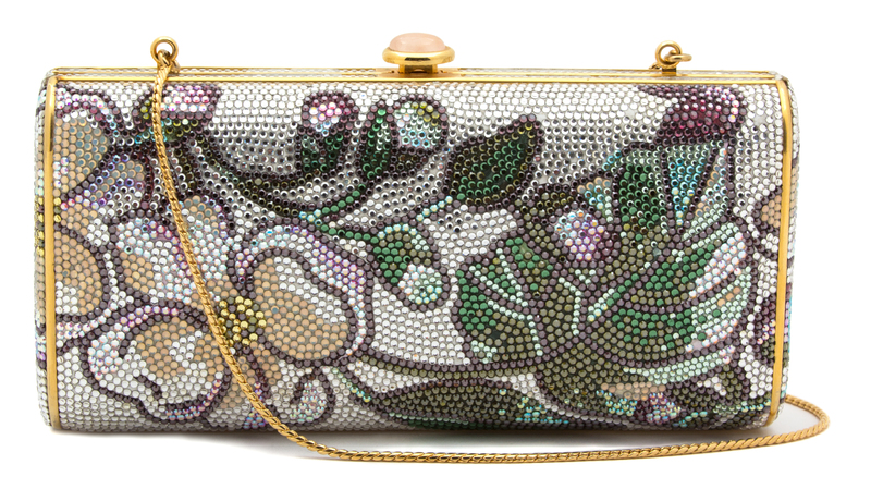 with goldtone hardware, a pale pink stone push button closure and a removable goldtone chain shoulder strap. Stamped: Judith Leiber.