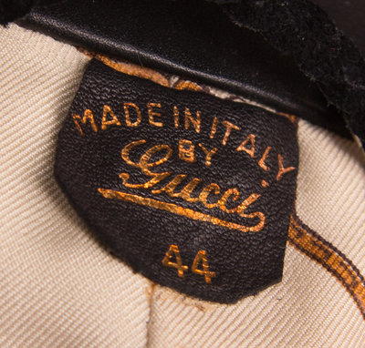 with a leather peter pan collar and matching leather cuffs, decorative matte black tiger head hardware, a flat leather belt with a "U" shaped tiger head buckle, leather patch pockets with flaps and a fully lined logo fabric interior.Labeled: Gucci.