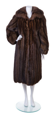 with a rounded collar, front hook closure, slip pockets and a decorative patterned silk lining.Unlabeled.