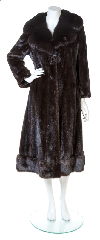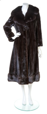 with a notched fox collar, a decorative fox trimmed hem, front hook closure, two slip pockets and a decorative floral embroidered brown silk lining.Unlabeled.