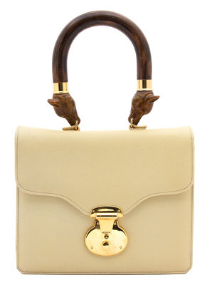 with goldtone hardware, a decorative wooden top handle with carved fox heads, a push button front lock closure, an exterior slip pocket, a removable shoulder strap, two interior compartments and a zip pocket. Together with a dustbag.Stamped: Anya Hindmarch.