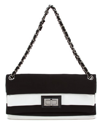 2008-2009, with a gun metal gray Mademoiselle front clasp closure, a fabric and chain shoulder strap, two interior compartments and one interior zip pocket.Stamped: Chanel.