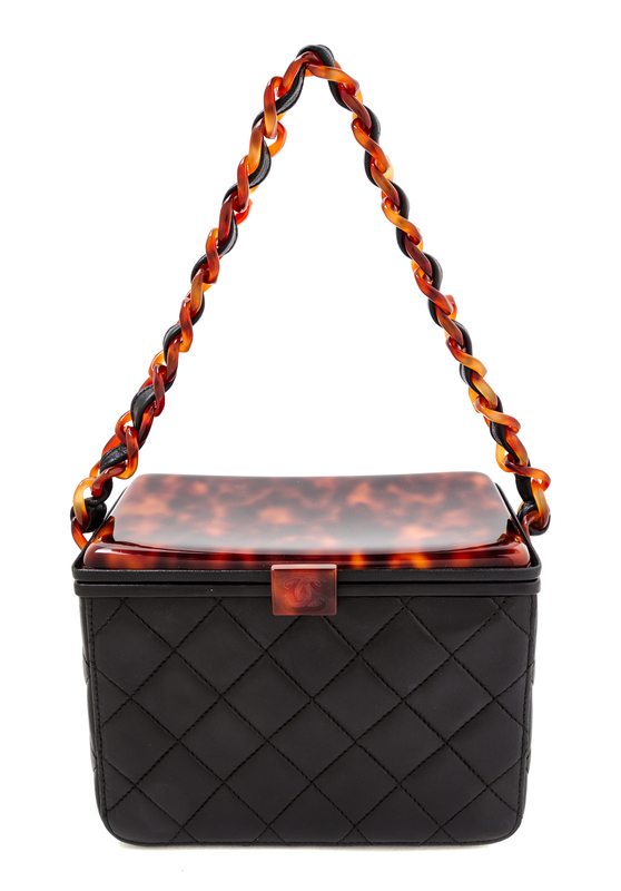 1996-1997,with a faux tortoiseshell top lid, a faux tortoiseshell and leather woven strap and a black leather interior with one slip pocket. Together with a dustbag. Stamped: Chanel