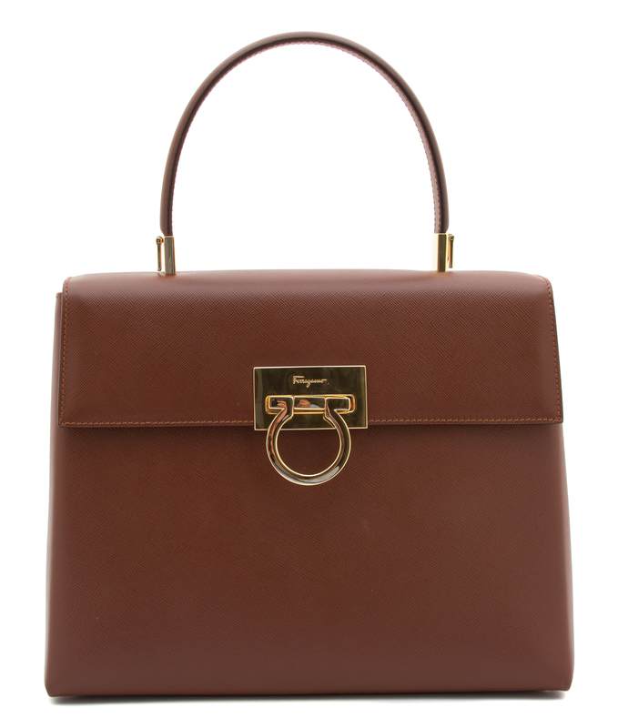 with a structured silhouette, goldtone hardware, a top handle, the iconic gancini front lock closure, a removable shoulder strap and two interior compartments, one with a zip closure. Together with a dustbag.Stamped: Salvatore Ferragamo.