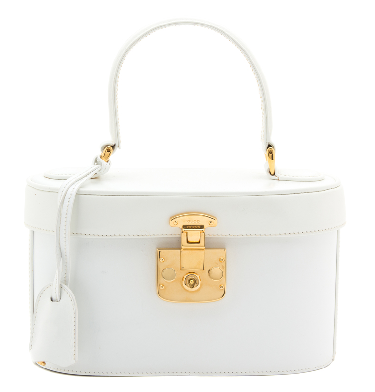 with goldtone hardware, a push lock front closure, a clochette with two keys, a single top handle, an attached interior mirror on the lid and an interior zip pocket. Together with a dustbag.Stamped: Gucci.