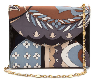 1960's - 1970's,with patent leather accents, a front snap closure, a goldtone chain strap and two interior compartments. Labeled: Emilio Pucci.