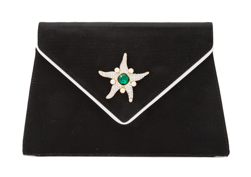 textured with white leather trim, a rhinestone starfish accented with five faux pearls and a green glass center stone, a front snap closure, a detachable leather strap with goldtone hardware, a red interior lining and one interior zip pocket.Stamped: Valentino Garavani.