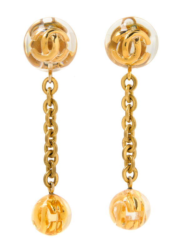 1990,with decorative goldtone logo detail and chain drops with a lucite ball embellishment. Together with a box.Stamped: Chanel.