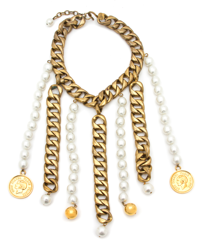 1970'swith a heavy link chain, strands of faux pearls and link chain with decorative coin and bead embellishment. Together with a box.Stamped: Chanel.