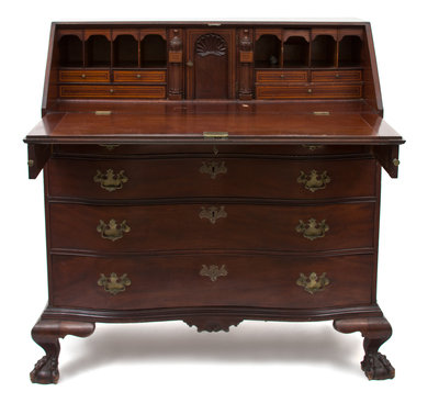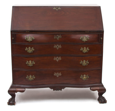 An American Chippendale Style Mahogany Slant Front Oxbow Desk