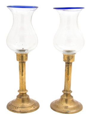 A Pair of American Brass Candlesticks with Blown Glass Hurricane Shades