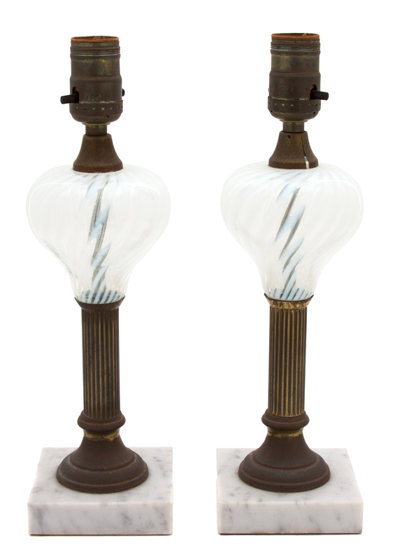 A Pair of American Swirled Glass and Brass Oil Lamps
