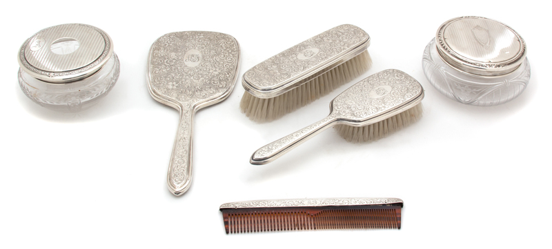 comprising a hair brush, clothes brush, mirror, comb and two sterling covered glass jars.