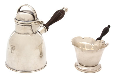 including a J.E. Caldwell sauce ladle with treen handle, and an unknown maker chocolate pot with treen handle